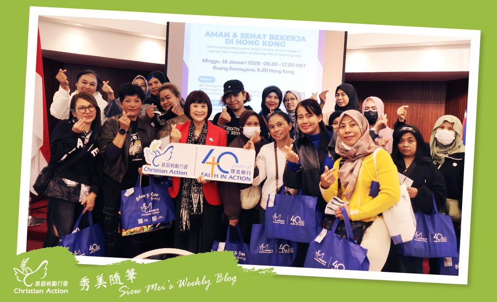 基督教勵行會自 1993 年起一直服務印尼籍外籍傭工。看到香港各界透過社論與報道,肯定外籍傭工在大火中的無私奉獻,令人倍感欣慰。當天的聚會充滿了笑淚交織的感動時刻。我當天亦派發了愛心福袋給出席的外籍傭工,並向她們傳達一個重要的信息:她們並不孤單——正如上帝與我們同在,而我們也會一直與她們同行。